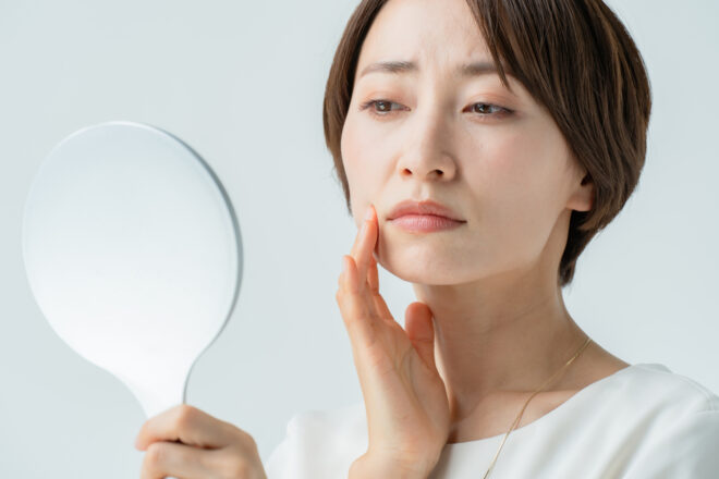年齢を重ねることで顔の筋肉が衰え、シワやたるみが増えると、口もとの輪郭がぼやけて下唇が前に出ているように見える場合があります。