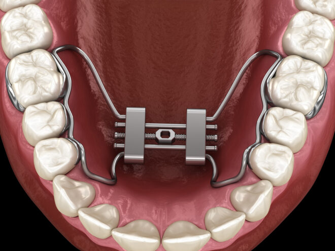 拡大床は、歯が並ぶ土台(歯列弓)を横方向に広げてスペースをつくる装置です。