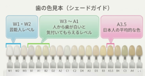 歯の白さを測るシェードガイドでは、デュアルホワイトニングはB1(天然歯の最高輝度の目安)を超え、W3(ホワイトニング専用の特別に白いグレード)に近づくことも可能とされています。