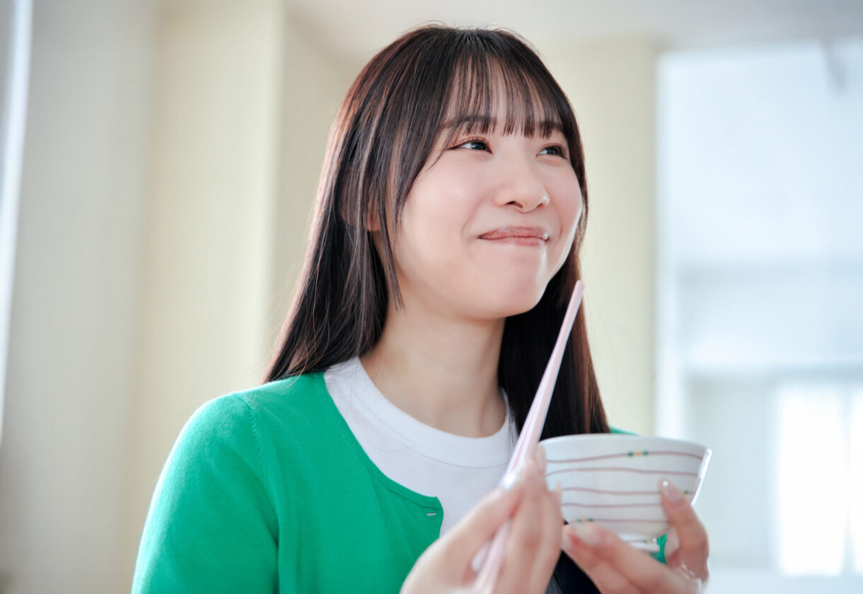 唾液の分泌を促すには、食事のときによく噛むことが大切です。しっかり噛むと唾液の分泌量が増えるだけでなく、物を噛み砕く際に歯の表面に付いた汚れが落ちやすくなります。